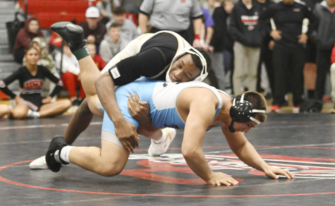 Messenger photo by Britt Kudla: Dreshaun Ross of Fort Dodge wrestles against Lewis Central's Joseph Monge in the Finals at 215 pounds on Saturday in the Dodger gym during a Class 3A district meet. For more photos, please visit CU.messengernews.net