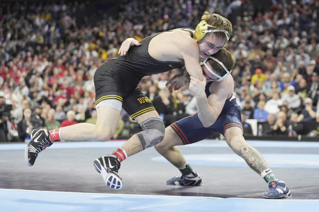 Iowa's Drake Ayala takes on Lucas Byrd of Illinois in their 133-pound NCAA championship match last season in Philadelphia. (AP Photo/Matt Rourke)