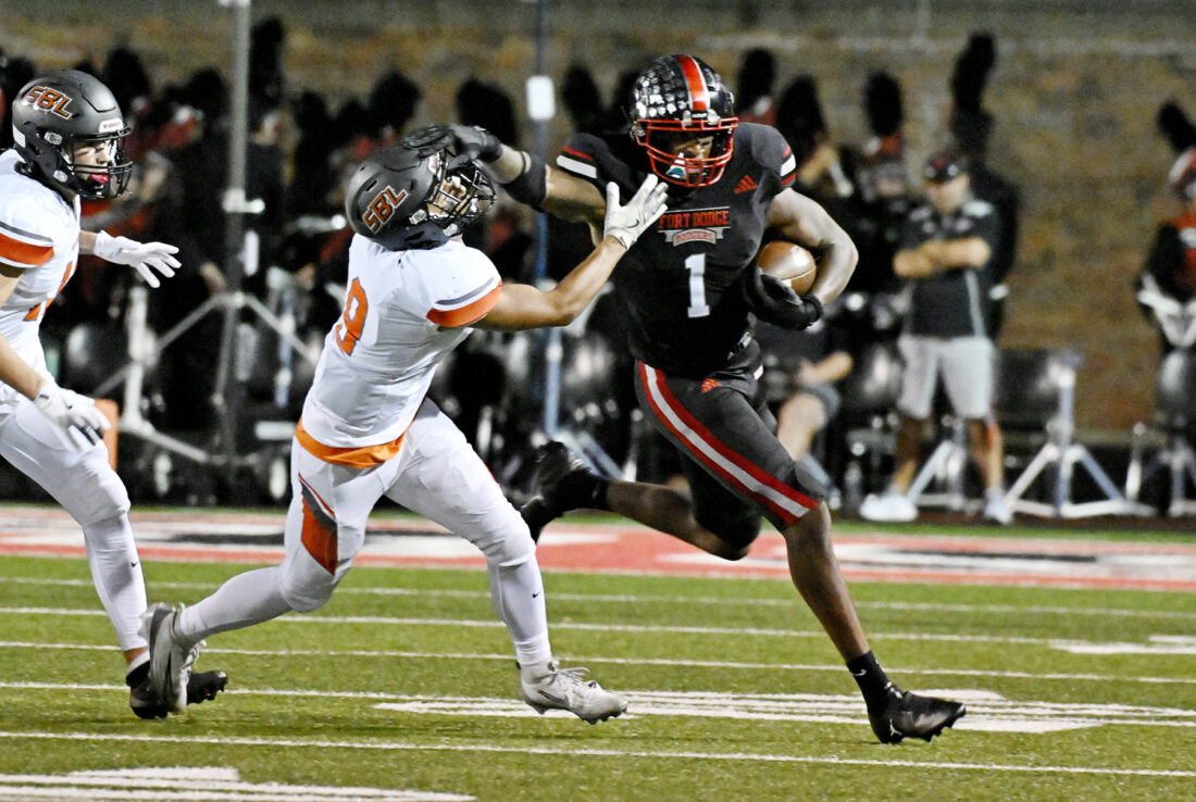 -Messenger photo by Britt Kudla Dreshaun Ross of Fort Dodge stiff arm a Sergeant Bluff defender inside dodger Stadium