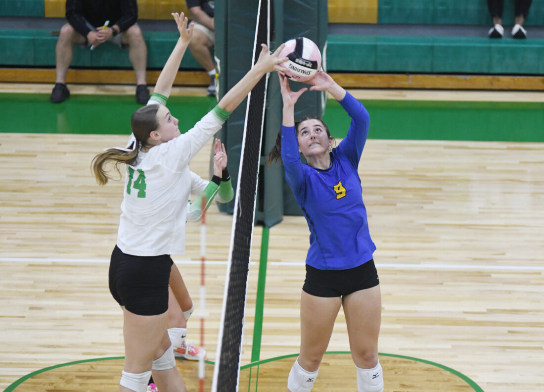 Messenger photo by Britt Kudla: St. Edmond's Eden Horn meets Addie Waldorf of Humboldt at the net on Thursday night in the Gael gym. For more photos, please visit CU.messengernews.net