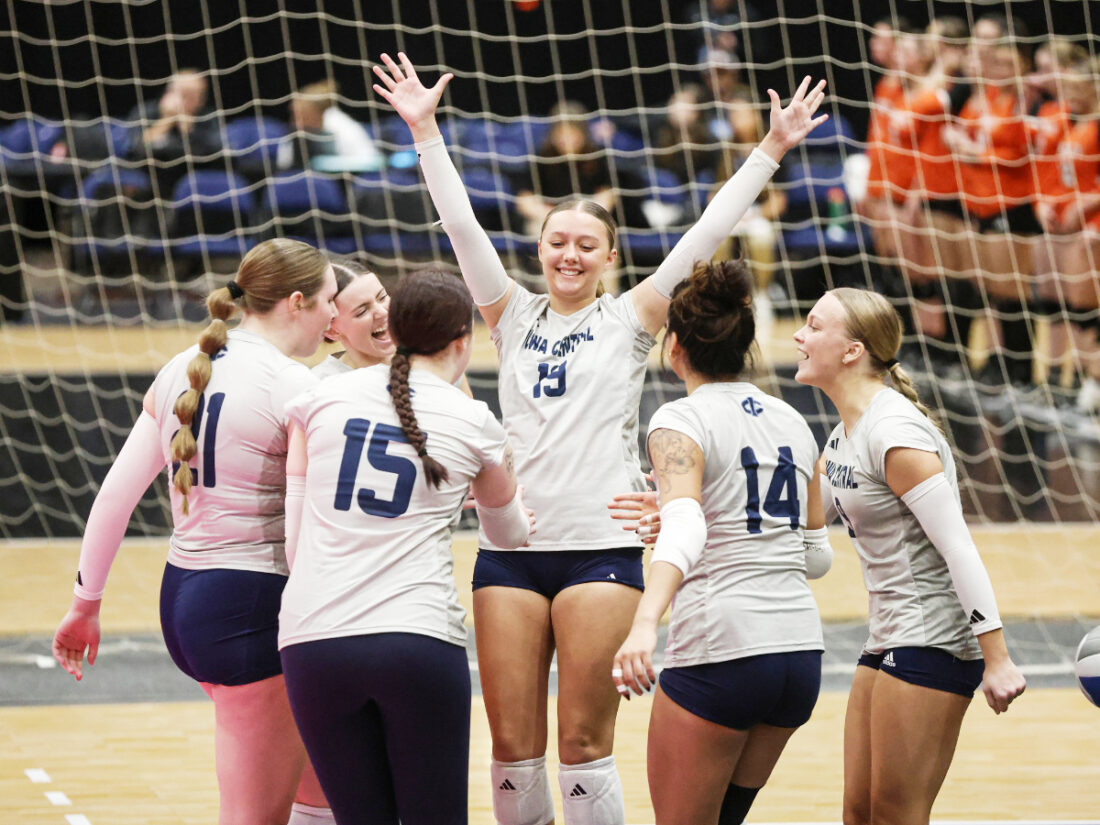 Photo courtesy of Iowa Central Athletics: Meya Wingert of Iowa Central (19) celebrates a point with her teammates at the NJCAA national tournament in Cedar Rapids.