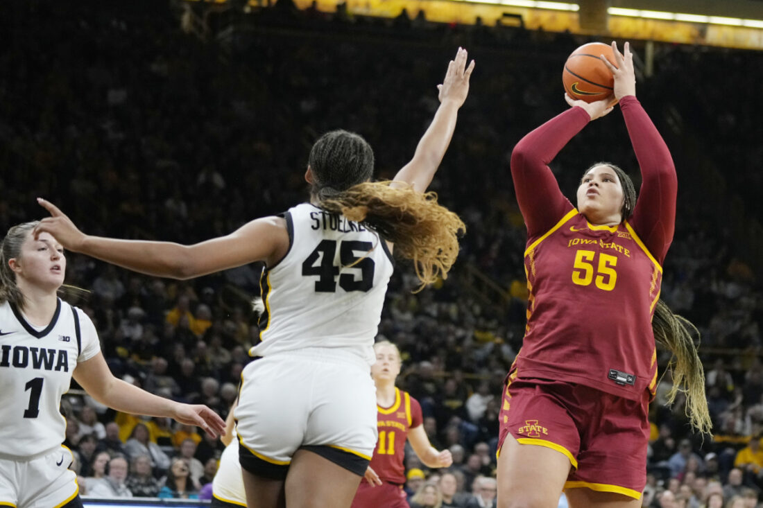 Iowa State center Audi Crooks (55) shoots over Iowa forward Hannah Stuelke last year in Iowa City. (AP Photo/Charlie Neibergall)