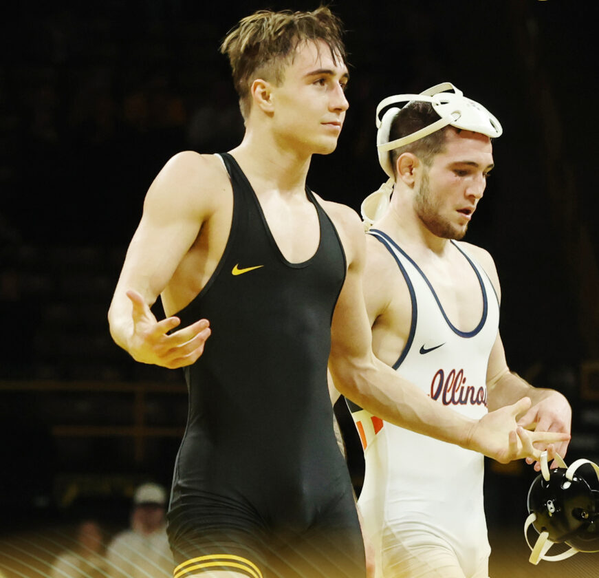 - Photo courtesy of Iowa Athletics: Drake Ayala reacts to a victory over Lucas Byrd of Illinois last year in Iowa City.