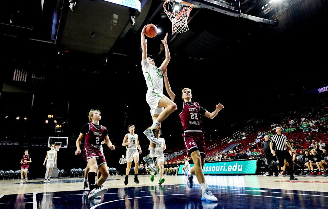 -Messenger photo by Britt Kudla Hunter Horn of St. Edmond goes up for a dunk against South Hamilton inside Wells Fargo Arena