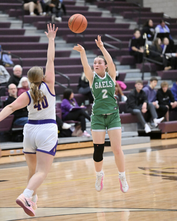 Photo by David Borer: St. Edmond’s Sophia Schlienz knocks down a three-point shot Friday night against Webster City.