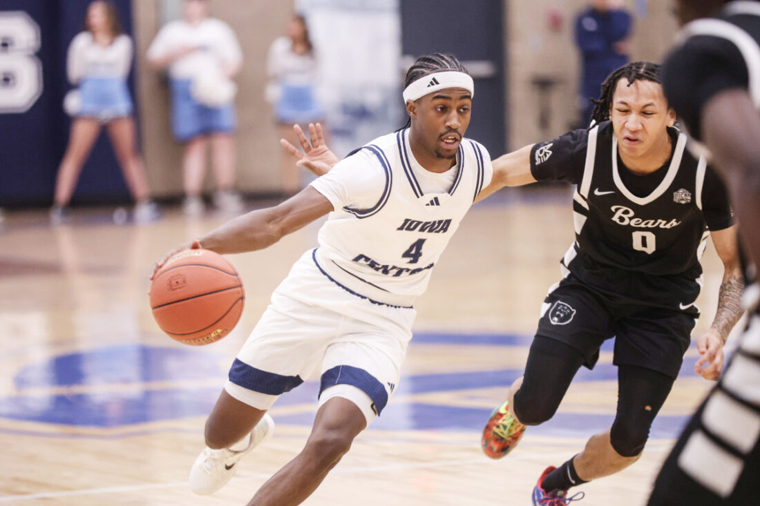 Photo courtesy of Iowa Central Athletics: CJ Mitchell of Iowa Central drives on Saturday against DMACC inside Hodges Fieldhouse.