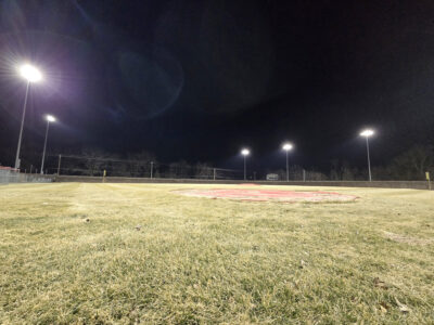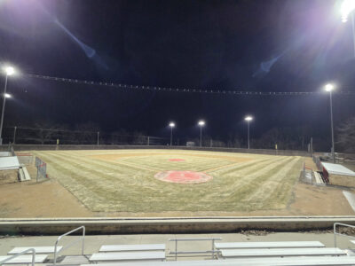 Dodger Stadium in Fort Dodge had its lights shining brightly on McNeil Field on Thursday from 7-9 p.m. in tribute to the Iowa Lakes baseball program. The Pocahontas Area Indian baseball program (sixth photo, taken by Jessica Bunda) did the same, with the initials “CJ” and Johnson’s #8 were carved out in the dirt, along with “Lakerstrong.”