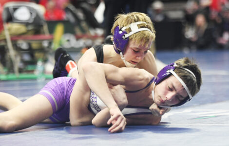 -Messenger photo by Britt Kudla Broedy Hendricks of Humboldt wrestles againstGrinnell Josh Ringler during 2A semi-finals on Friday inside Casey's Center in Des Moines