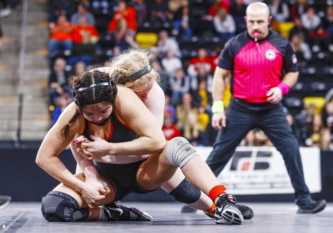 Fort Dodge's Mariaha Benedict competes against Ames' Lexa Rozevink in the 135 pound third-place bout of the Iowa Girls High School Athletic Union girls state wrestling championships on Friday at Xtream Arena in Coralville.