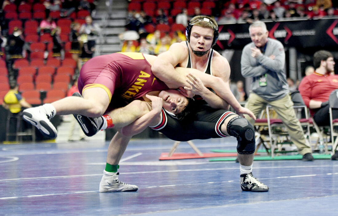 -Messenger photo by Britt Kudla Rylee Brown of Fort Dodge wrestles against Ankeny Calvin Rathjen during 3A semi-finals on Friday inside Casey's Center in Des Moines