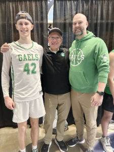 “My favorite moments came in the last few minutes of the game when we knew we had the title (clinched) and I was able to celebrate with my guys,” said Carson, who scored a combined 43 points for the Gaels in the three state contests. “I’ll never forget seeing my dad in the crowd and us pointing at each other, then touching my (jersey number) 42 (the same as Cory’s in 2000) and pointing up to heaven.