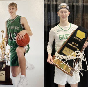 Submitted photos: Cory Bargfrede (left) and Carson Bargfrede were on the 2000 and 2026 St. Edmond state championship basketball teams, respectively, under long-time Gael head coach Adolph Kochendorfer.