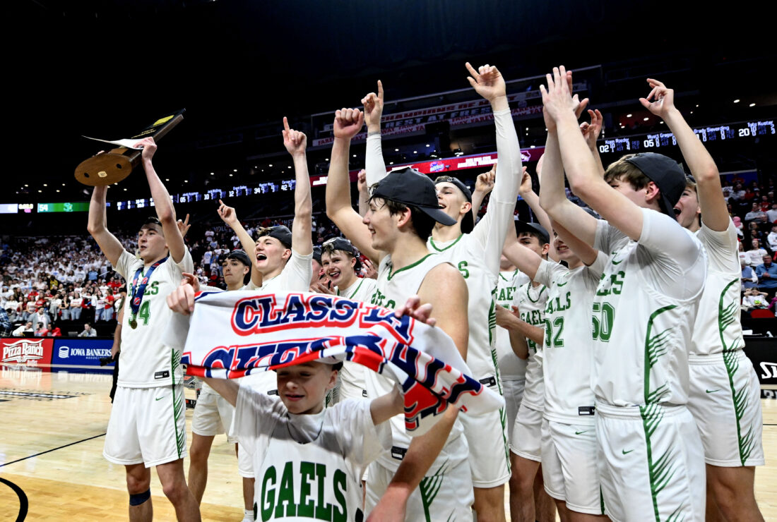 Messenger photo by Britt Kudla: The St. Edmond boys celebrate their Class 1A state title on Friday in Des Moines.