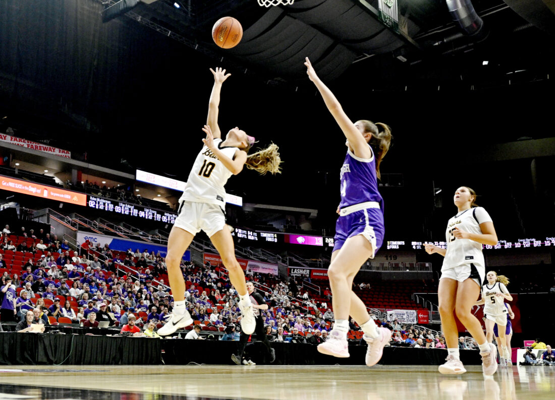 Quarter scores: BG led 16-5 29-16, 49-29. Three-point goals: Lansing Kee (0-16) Mudderman 0-8, Kolsrud 0-4, Elena Schulte 0-4. Bishop Garrigan (7-34) Bartolo 2-10, Eastman 0-1 Tigges 0-1, C. Nielsen 2-5, Alesch 2-8, Berte 1-1, Haugland 0-2, Faris 0-2, R. Nielson 0-1, Ludwig 0-2, Roethler 0-1. Total rebounds: Kee 41, Bishop Garrigan 43; Assists: Kee 8, Bishop Garrigan 17. Steals: Kee 7, Bishop Garrigan 11. Blocked shots: Kee 0, Bishop Garrigan 11; Turnovers: Kee 15, Bishop Garrigan 10. Total fouls: Kee 7, Bishop Garrigan 13.