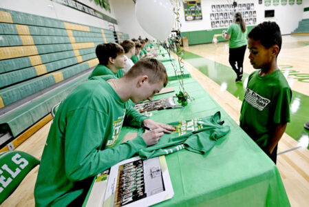 - Messenger photo by Britt Kudla: Hunter Horn of St. Edmond autographs a shirt for Kayson Lukowych, age 7, of Fort Dodge on Monday in the Gael gym.