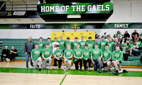 - —Messenger photo by Britt Kudla: The St. Edmond boys basketball squad poses together on Monday night at the Gael gym.