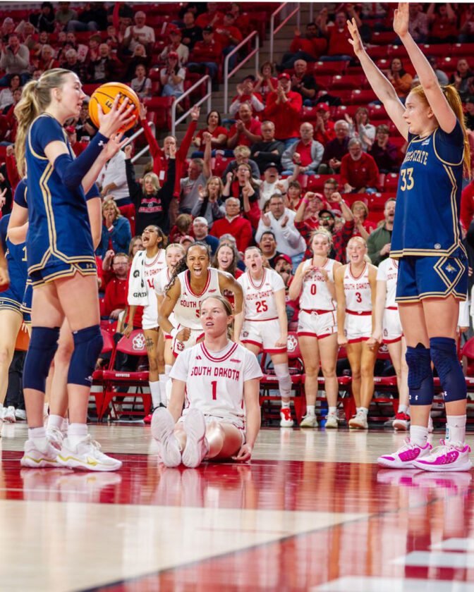 —Photo courtesy of South Dakota women’s basketball Bishop Garrigan graduate Molly Joyce led South Dakota with 16 points in their WNIT game against Illinois State.