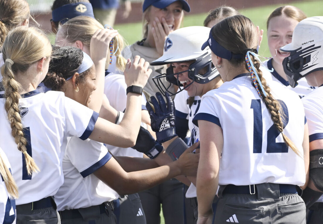 —Messenger photo by Britt Kudla iowa central players congratulate Ellie Nolte after one of her four homeruns against Central on Wednesday at Rogers Park. For more photos, visit CU at messengernews.net