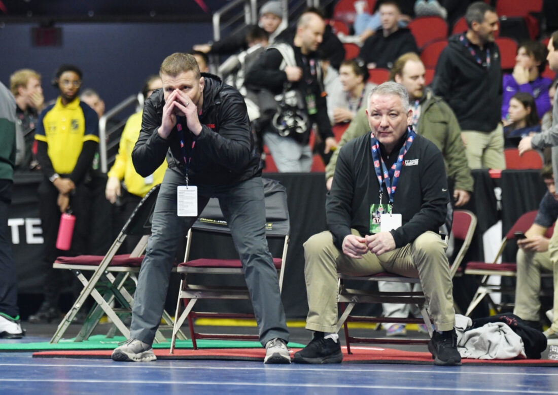 Messenger photo by Britt Kudla: Mark Rial (left) coaches alongside Bobby Thompson at the state wrestling tournament. Rial, a two-time Fort Dodge state champion, will replace Thompson as the program’s new head coach.