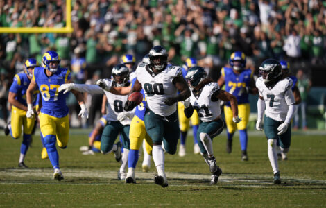 PHILADELPHIA (AP) — Jordan Davis clutched the ball in his outstretched right hand as he reached the end zone and had no choice but to freeze and meet the mob of Eagles sprinting his way.