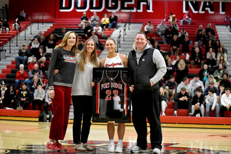 Fort Dodge senior LJ Maehl was honored on Tuesday night as the school’s all-time scoring leader. Pictured left to right with Maehl are, Molly Nelson (No. 2 on scoring list), and Rachel (Thompson) Maehl and Ryan Maehl, the parents of the Dodger senior.