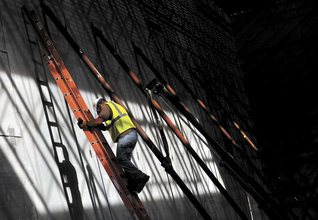- -Messenger photo by Hans Madsen Brian Denning, of Zimmerman, Minnesota, climbs down a ladder while working to remove bracing from the precast concrete wall sections that compose the gym walls at the new Duncombe Elementary School. Denning is with Midwest PreCast.