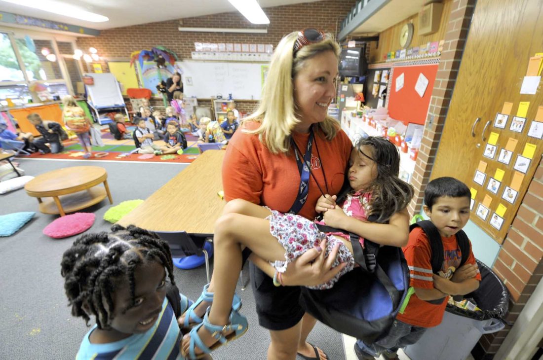 - -Messenger photo by Hans Madsen The end of the day came rather suddenly for Izabellah Vazquez, 5, as she fell fast asleep at the end of her first day of kindergarten at Cooper Elementary. Her she gets a little help from Stacey Christy who carried her into the gym to await her ride back to daycare.