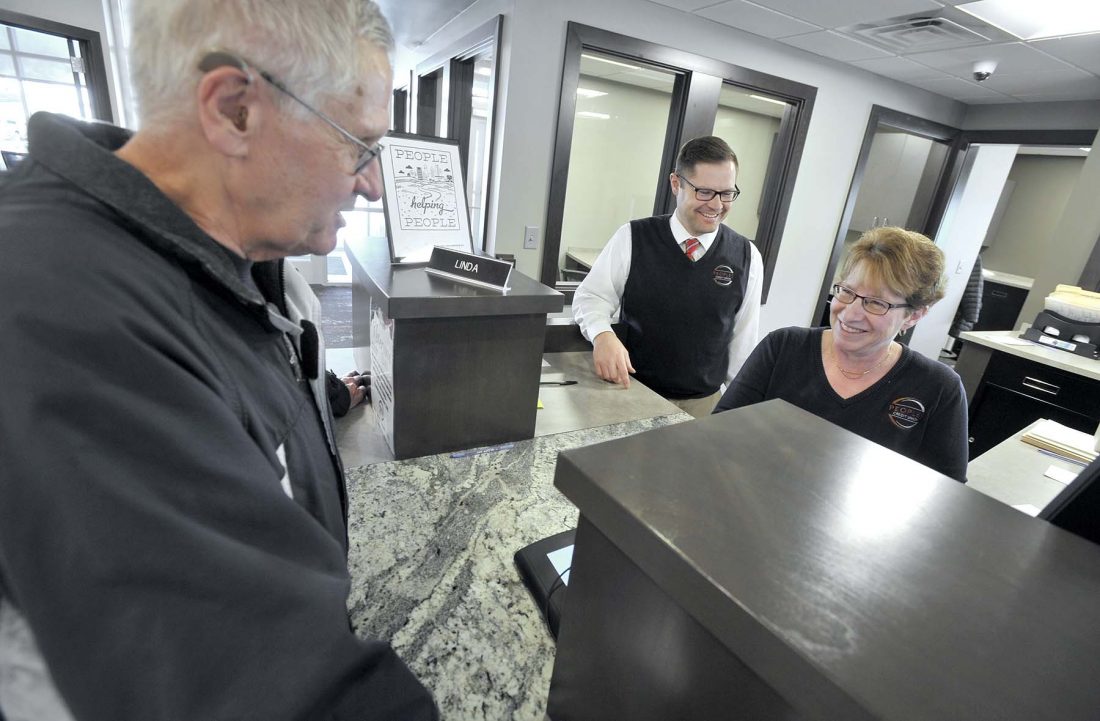 Peoples Credit Union member Rudy Knight stops to visit with Member Services Representative Linda Dangelser and CEO Jordan Hensley.