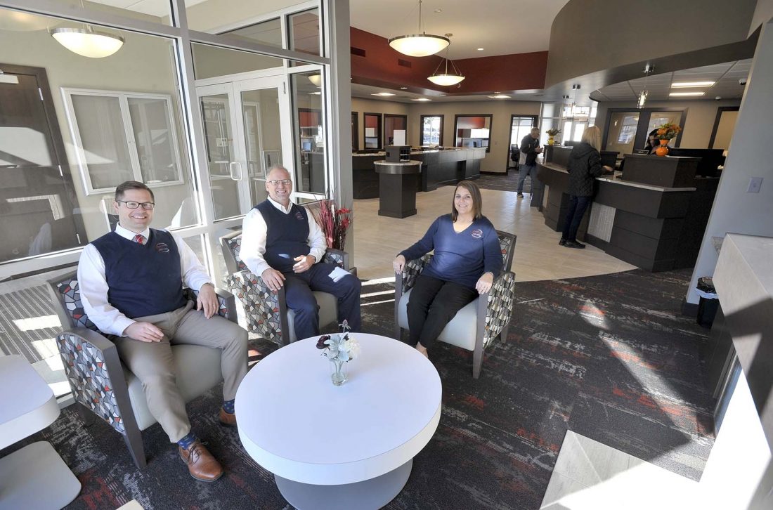 Peoples Credit Union CEO Jordan Hensley, at left, Vice President of Member Services Keith Osterberg and Branch Manager Mandy Beckman enjoy the comfortable well-lit customer waiting area in their newly opened location at 1717 Fifth Ave. S. in Fort Dodge.